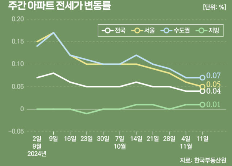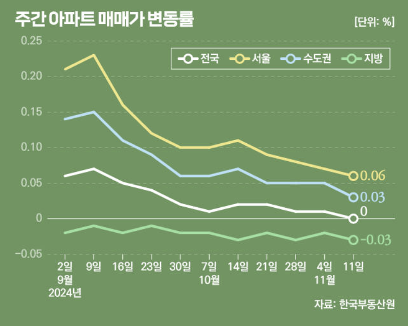 한국부동산원에 따르면 11월 둘째주 전국 주간 아파트 매매가격은 지난주 대비 보합 전환했습니다. 서울 아파트의 상승률은 0.06%로 전보다 차분해졌으며, 강남과 서초, 용산 정도만 뜨거운 상태를 유지하고 있습니다. 매수자들은 매매시장에서 임대차 시장으로 눈을 돌리고 있지만 대출 규제는 여전합니다.