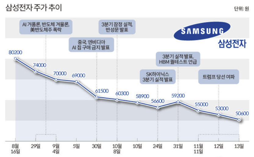 삼성전자는 최근 인공지능(AI) 반도체 및 파운드리(위탁 생산) 시장에서 경쟁력을 잃었다는 평가를 받고 있어요. 이러한 상황은 반도체 업황에 대한 회의적인 시각과 맞물려 더욱 부각되고 있답니다. 주주들은 "이러다 4만전자 가겠네"라는 우려 섞인 반응을 보이고 있었으며, 경영진은 이 상황을 극복하기 위한 노력이 필요 했습니다. 그러나 추가 하락을 막지 못했습니다.